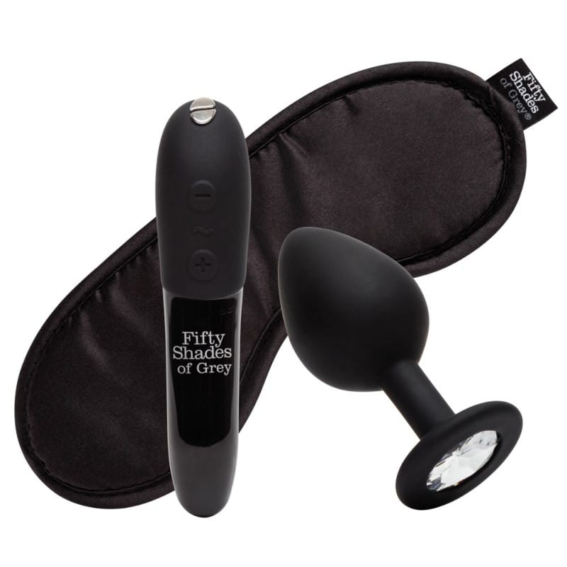 3-dijelni set “Come To Bed” iz brenda Pedeset nijansi sive uključuje We-Vibe Tango X mini vibrator, kristalni analni čep i satensku masku za oči.
