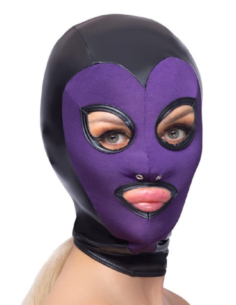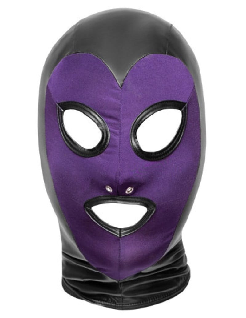 Visoko elastična maska za glavu koja dobro prianja uz kožu. Crno – ljubičasto. S velikim, crnim cijevima na očima i ustima, kao i rupicama za nosnice. Jedna veličina – pristaje NJEMU jednako dobro kao i NJOJ.