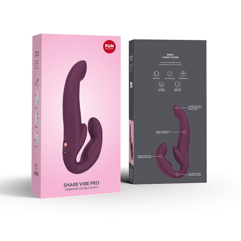 Dvostrani vibrator bez pojasa Share Vibe Pro od brenda Fun Factory je nadograđena verzija s naprednijim funkcijama u odnosu na osnovni Share Vibe, a nudi jače vibracije, dodatne opcije prilagodbe i još poboljšane materijale.